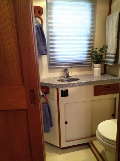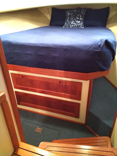 The forward master stateroom is complete with an island pedestal bed, rather than the standard V-berth, offering spacious and comfortable sleeping accommodations. There is a 3" memory foam mattress in lieu of standard. Two reading lamps, plus lots of overhead lighting, and an overhead opening hatch, with screens. There are storage lockers outboard of the berth, and two tall, cedar lined hanging lockers. The berth itself also houses a set of lockers, with easy access to additional storage underneath. It even has a hamper and wet boot storage locker.