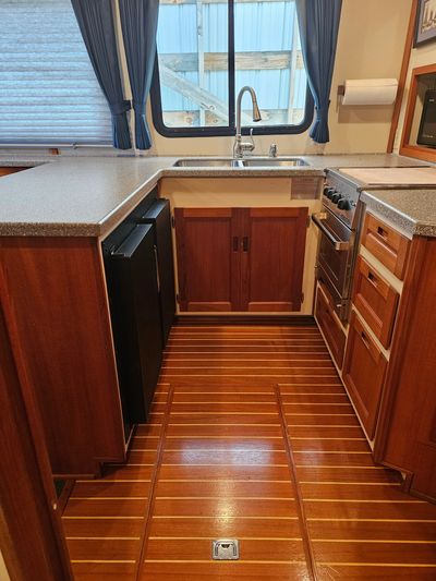 A truly all season cruiser. Her full-beam salon layout opens up the salon to allow not only excellent living space, but a large and completely equipped galley as well. She is equipped for underway operation in stocking feet from her warm dry pilothouse, in addition to having installed screens for all doors and windows’, keeping you cool as air flow is effortlessly circulated. All windows are marine Sea Glaze. A pleasant feature is her covered aft deck to shield you from the sun and rain.