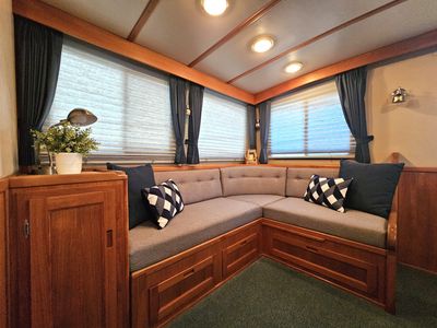 Entering the yacht through the cockpit door to the salon, you will find large opening windows all around bringing in lots of natural light and offering outstanding vistas. The salon settee is to starboard and converts into additional sleeping accommodations when needed. Sound dampening headliner panels and reading lamps give that at home feeling.